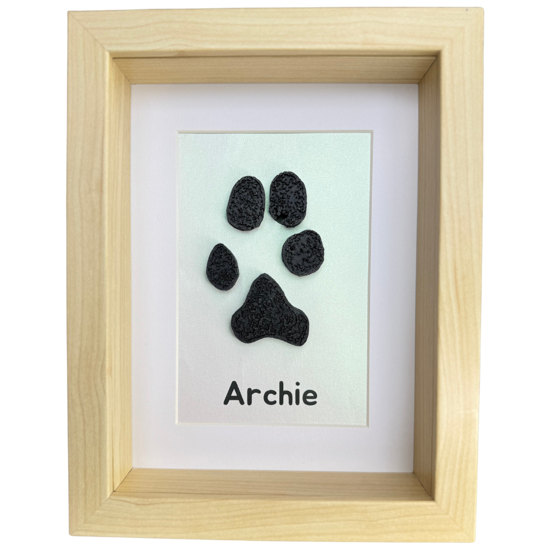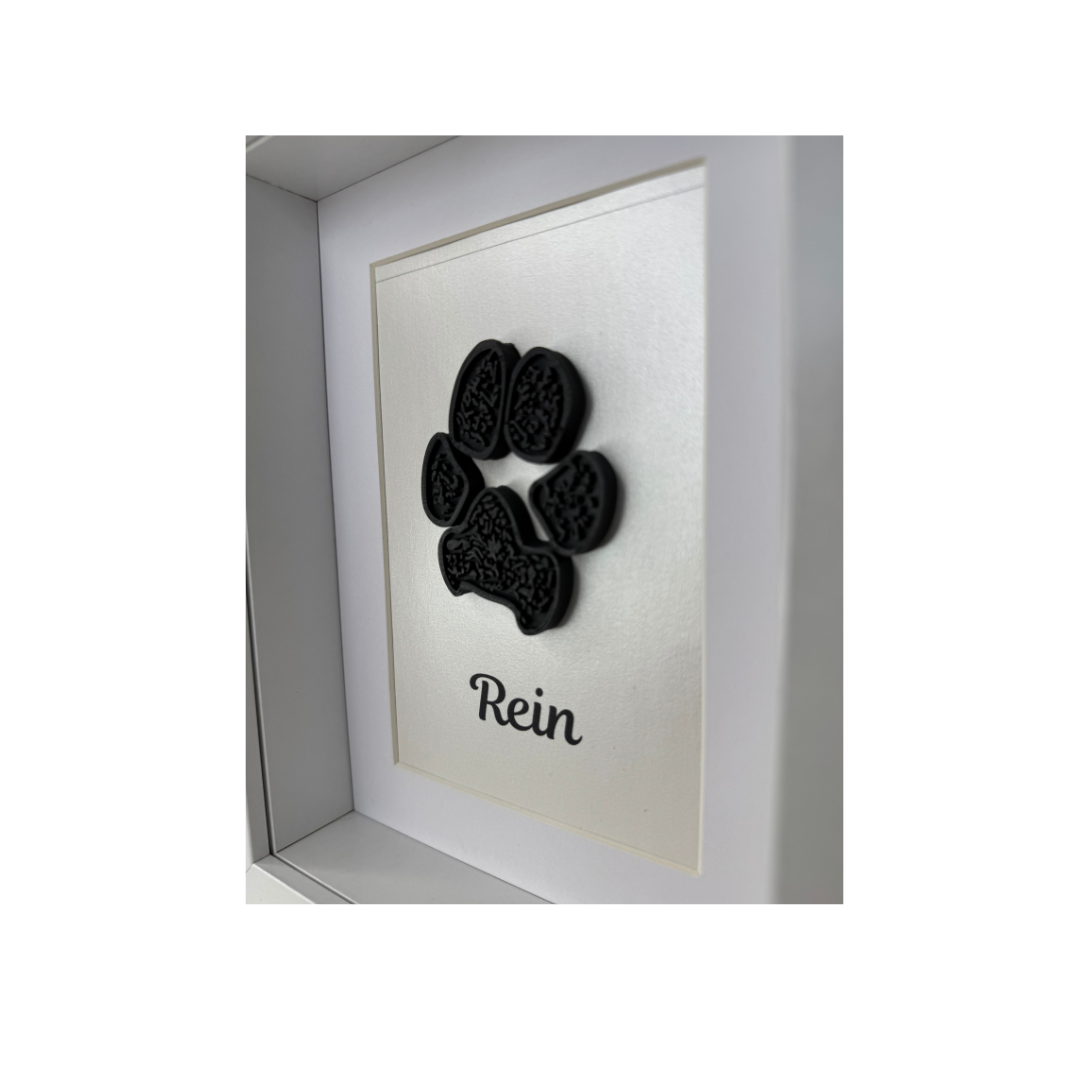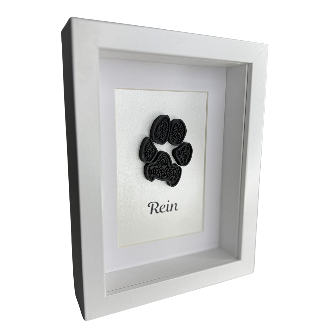 Each paw print is 3D printed with care and framed in a 15x20cm shadow box frame that's perfect for shelves, desks or walls.