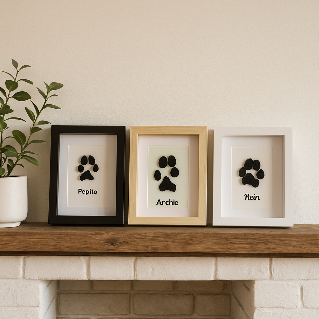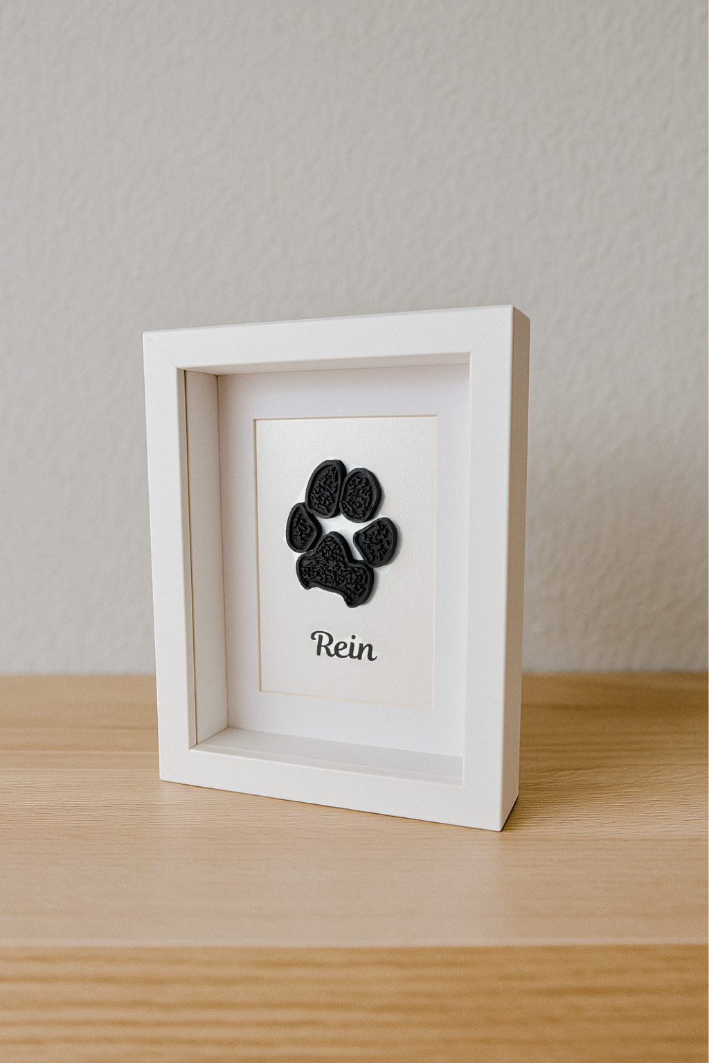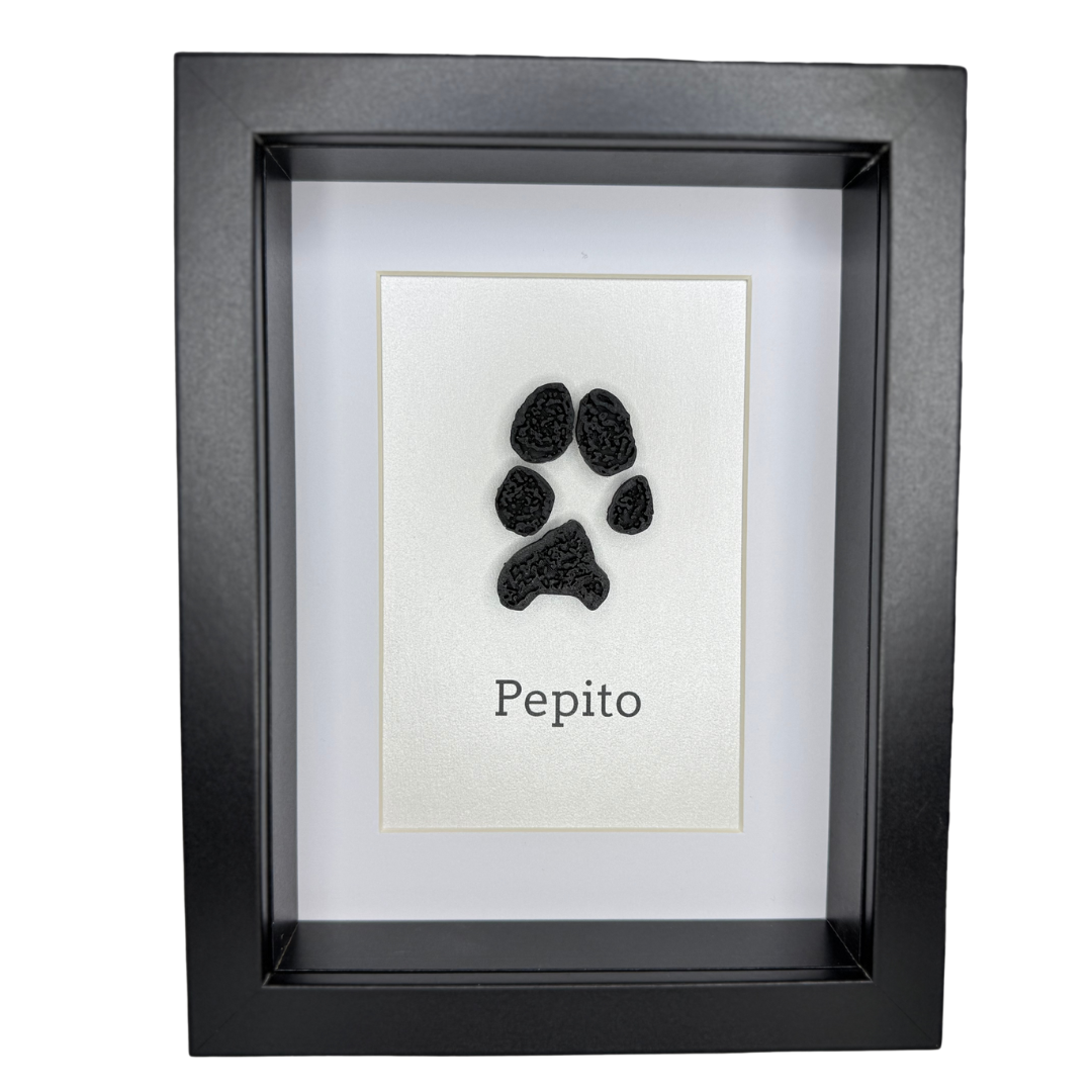 Each paw print is 3D printed with care and framed in a 15x20cm shadow box frame that's perfect for shelves, desks or walls.